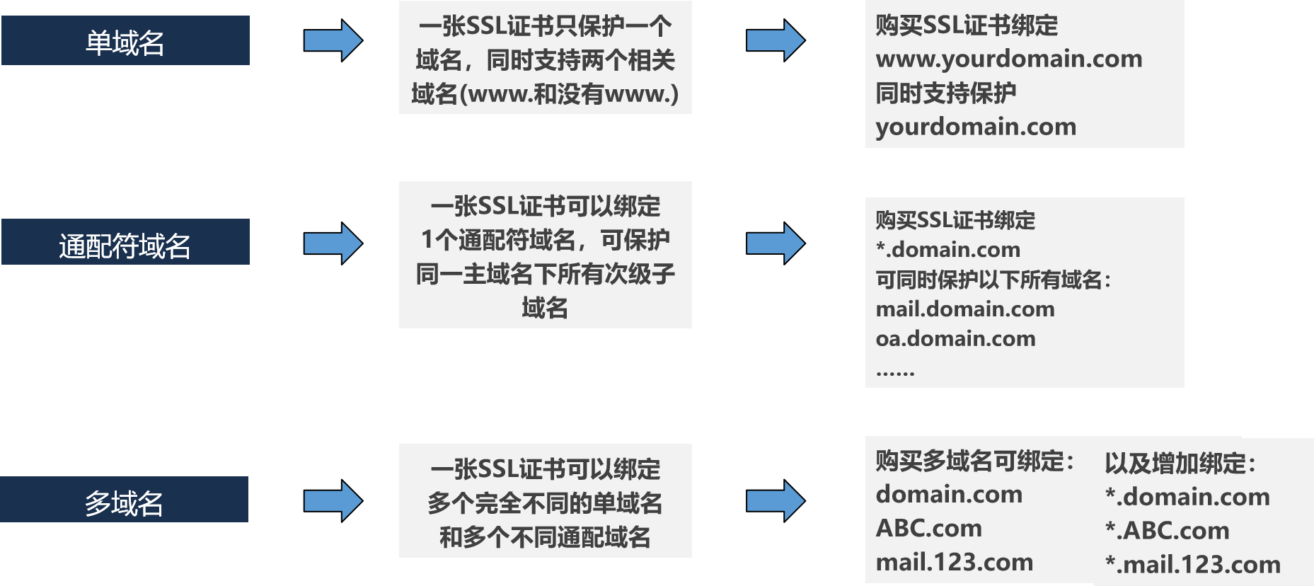 这种类型的证书可以同时保护多个域名,例如:同时保护www.abc.com、bcd.com;a.store.cn等; 不同品牌的多域名证书默认保护的域名数量不一样。